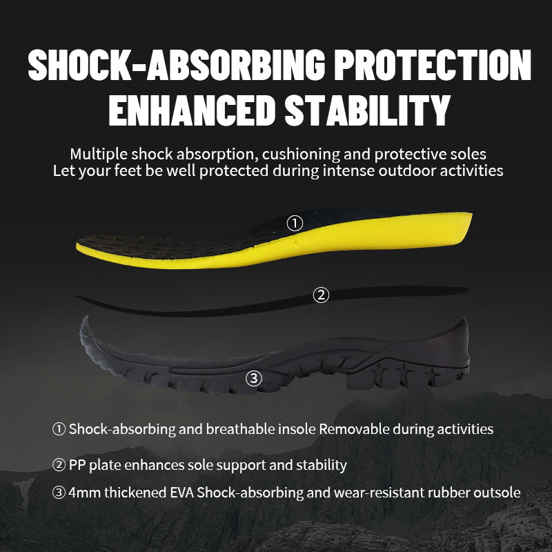 ①کفی دارای بالشتک و قابل تنفس — زمانی که نیاز به تمیز کردن یا تعویض آن دارید، قابل جدا شدن است. ②تقویت شده با یک صفحه PP برای حمایت بیشتر از زیر پا—بنابراین هر مرحله محکم و کنترل شده به نظر می رسد. زیره لاستیکی ③ 4 میلی متر ضخیم شده EVA ضربه گیر و مقاوم در برابر سایش.
