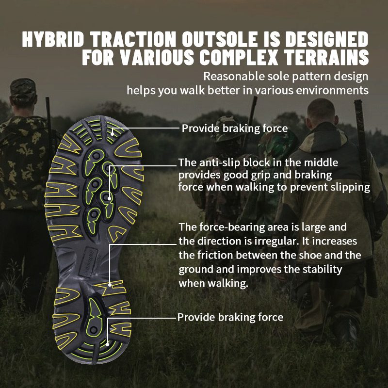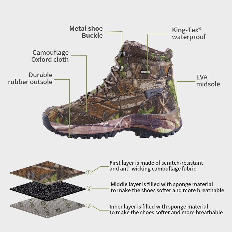 ① کفی ضد رطوبت با کشش بالا، داخل را خشک نگه می دارد. ② زیره میانی EVA، پیچیده شده در پارچه استتار، بالشتک و جذب شوک. ③ زیره لاستیکی بادوام، ضد لغزش و مقاوم در برابر سایش.