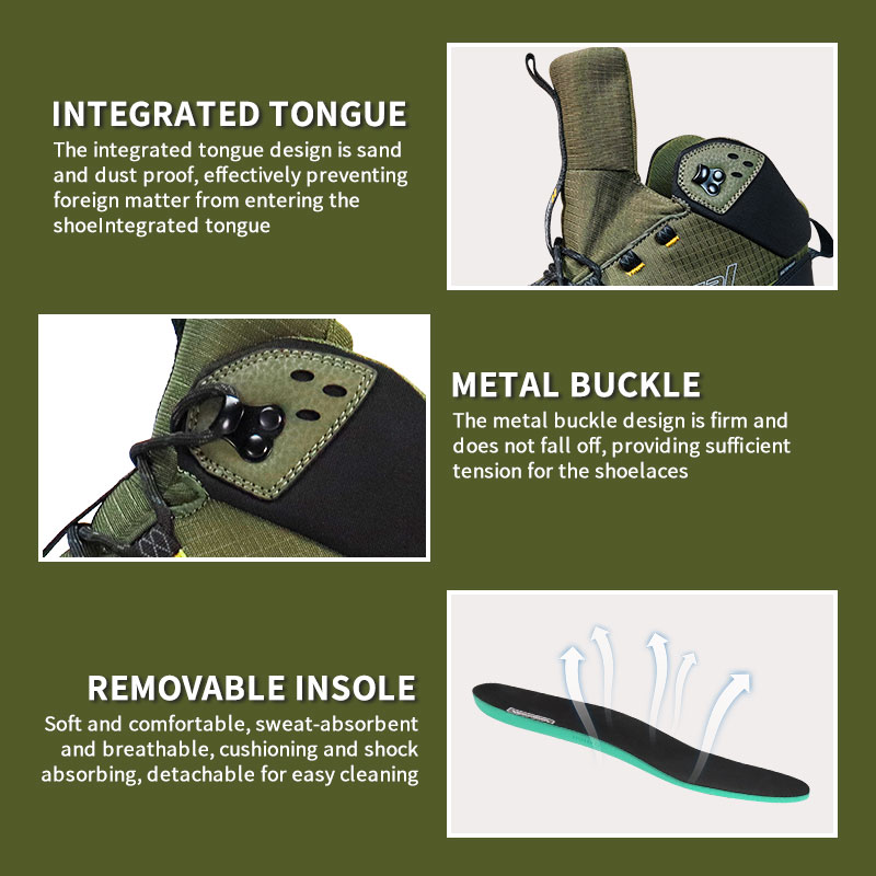 با توجه به این نوع کفش های بالاتنه ای با فشار حرارتی TPU ، تولید کننده کفش های چینی، هاناگال خدمات سفارشی سازی، از جمله آرم کفش، مواد، رنگ، و غیره را ارائه می دهد. اگر نیاز به سفارشی سازی دارید، لطفاً برای اطلاعات بیشتر با خدمات مشتریان ما تماس بگیرید. علاوه بر این، می توانید این نوع (آبی تیره) کفش کوهنوردی با MOQ 10 جفت را سفارش دهید. و این نوع چکمه های پلیس دارای مزایای زیر هستند: